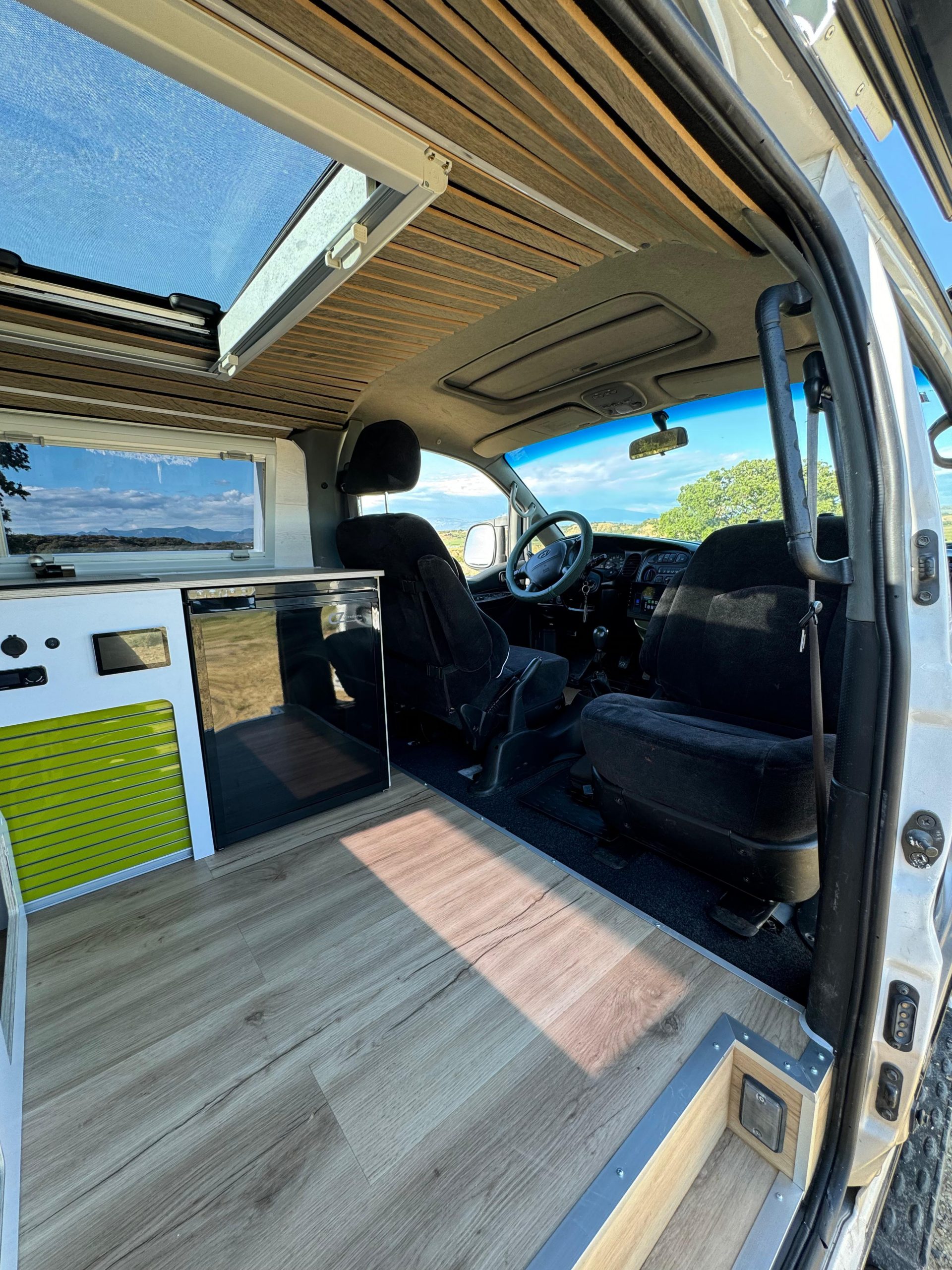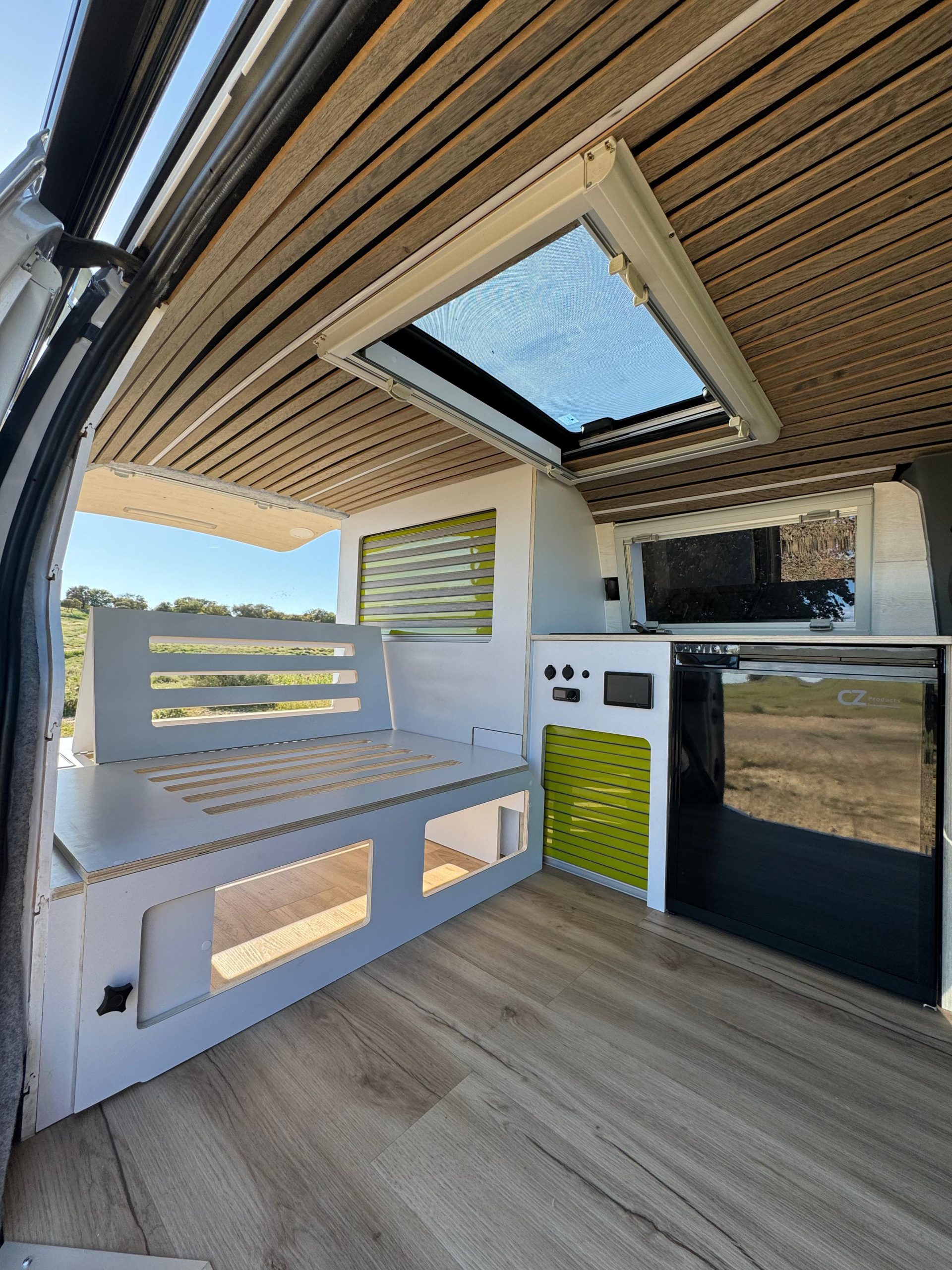 El interior está diseñado para ofrecer descanso y funcionalidad en un formato compacto. Se ha revestido con friso de madera MDF de alta calidad y techo en alistonado decorativo, creando un ambiente acogedor y cálido. El suelo de lama vinílica efecto parquet aporta un toque elegante y resistente. El asiento del copiloto cuenta con base giratoria para ampliar el espacio del salón. Las ventanas laterales incluyen oscurecedores y mosquiteras, permitiendo privacidad y ventilación.
