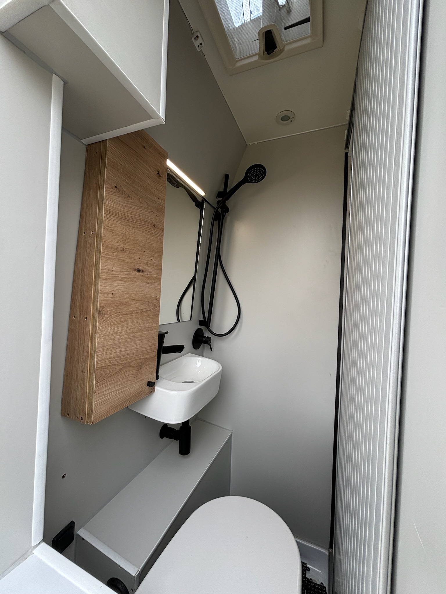 Esta camper incluye un baño cerrado de gran tamaño, con lavabo, ducha interior y WC incinerador Cinderella, una solución moderna, limpia y sin productos químicos. La ducha exterior de agua fría es perfecta para los días de playa o para refrescarte en plena naturaleza. Todo ello con agua caliente asegurada gracias al boiler Truma.