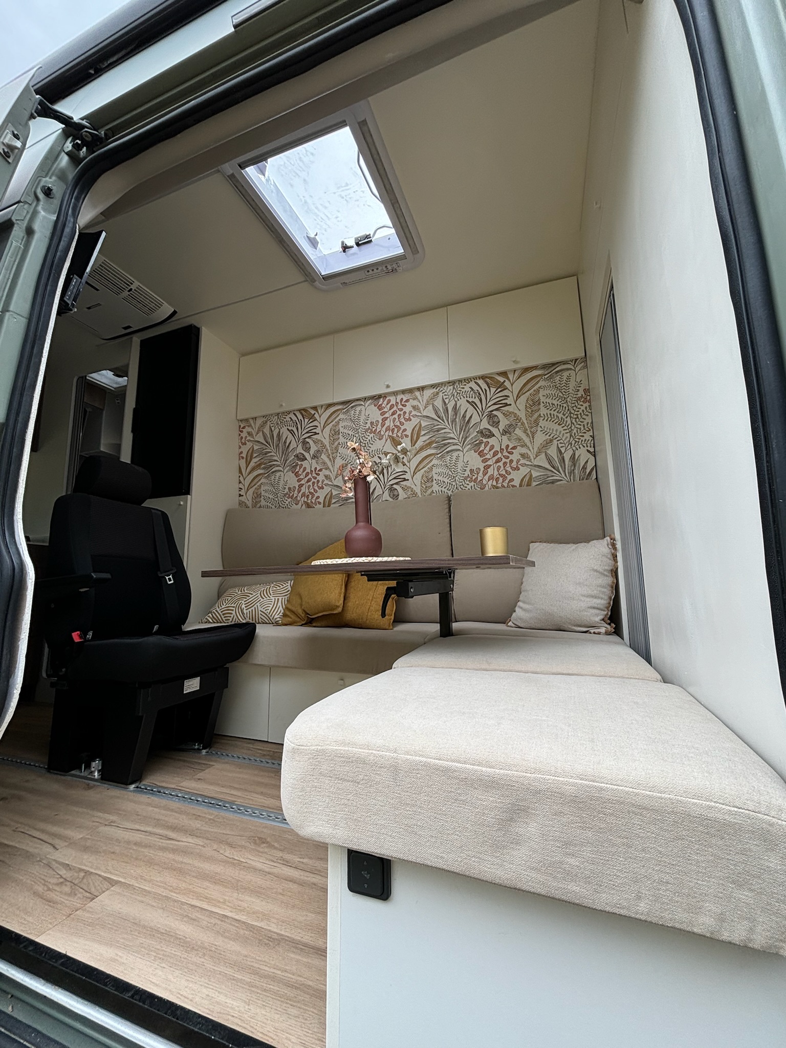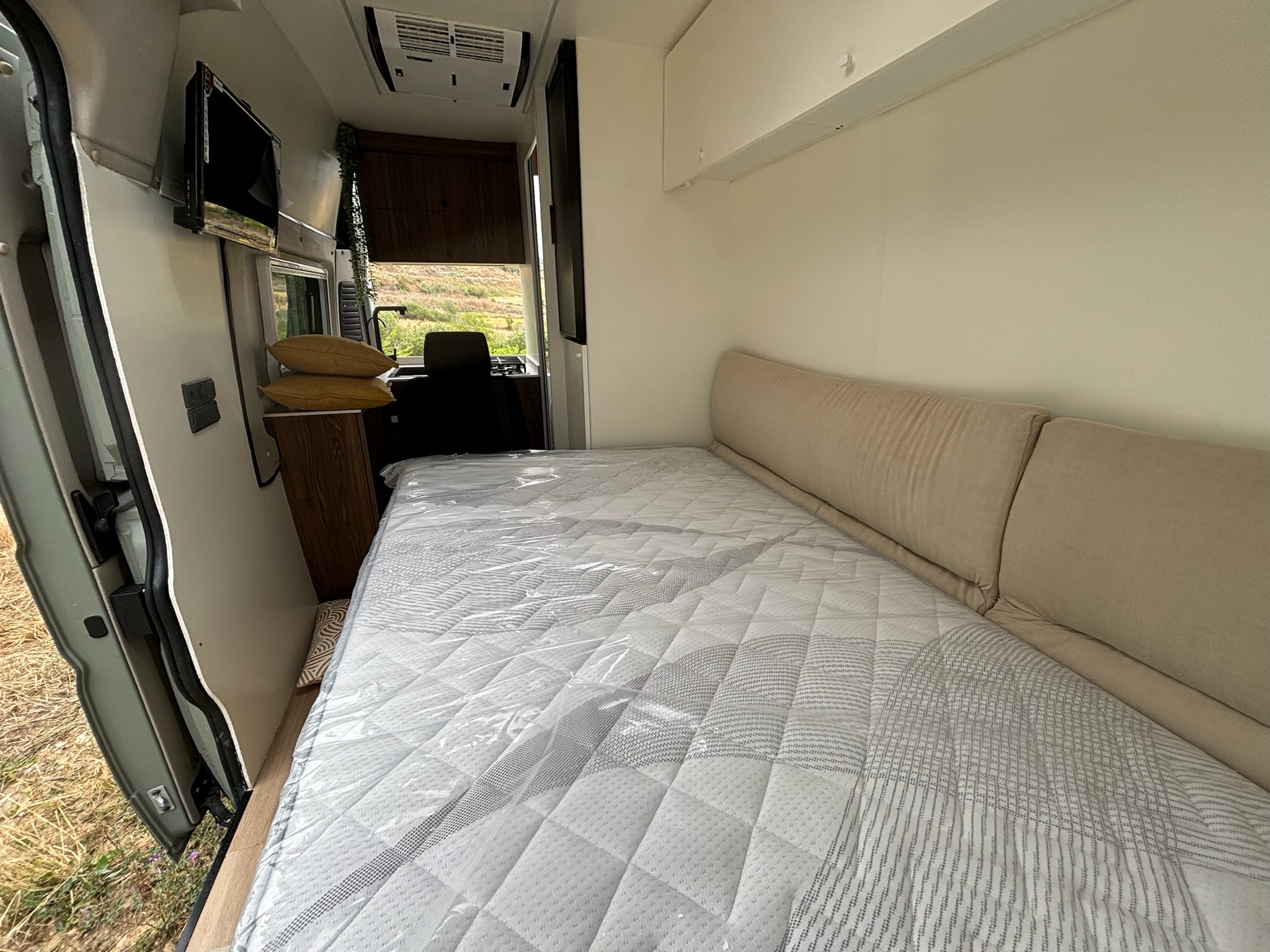 Diseñamos esta camper pensando en quienes valoran el espacio y la flexibilidad. La cama lateral plegable (140×185 cm aprox.) se oculta fácilmente para dejar paso a una zona de salón amplia y abierta. Aquí es fácil imaginar una cena relajada, una película en la TV integrada o una tarde de descanso tras un día de ruta.